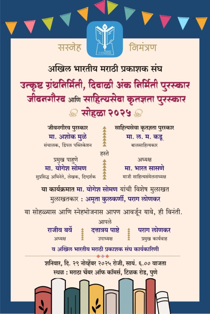 दि. २९ नोव्हेंबर रोजीच्या आपल्या पुरस्कार सोहळ्याची निमंत्रणपत्रिका देत आहोत. सर्व पुरस्कार विजेत्यांचे कौतुक, जीवनगौरव विजेत्यांचा सन्मान आपल्या सर्वांतर्फे होणार आहे. त्यामुळे सर्वांची उपस्थिती आवश्यक आहे. सर्व सभासद, प्रकाशक, ग्रंथविक्रेते, लेखक, पुरस्कारांचे प्रायोजक, साहित्यप्रेमी अशा आपणा सर्वांना अगदी मनापासून हे निमंत्रण देत आहोत.